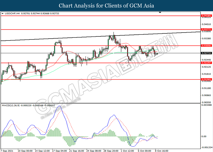 USDCHF, H4: USDCHF telah didagang dengan lebih rendah selepas ia berundur dari tahap rintangan 0.9305. MACD yang memaparkan momentum bearish mencadangkan pasangan ini untuk melanjutkan kerugiannya ke arah tahap sokongan 0.9230.