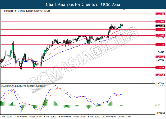 GOLD_, H1: Harga emas didagang dengan lebih tinggi selepas ia melantuin dari tahap yang lebih rendah. Namun, MACD yang memaparkan isyarat momentum bullish yang berkurangan mencadangkan komoditi ini untuk didagang dengan lebih rendah sebagai pembetulan teknikal.