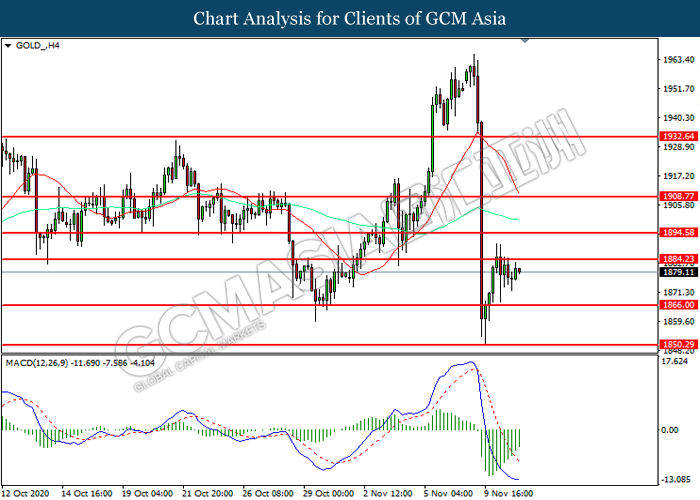 Di pasaran komoditi, harga minyak mentah melonjak sebanyak 0.21% kepada $ 41.85 setong semasa penulisan kerana pasaran kekal positif terhadap harapan vaksin. Berita vaksin pada Isnin dari Pfizer Inc masih meningkatkan pasaran dengan beberapa pelabur melihat cahaya di hujung terowong COVID-19. Namun, masih ada jalan yang panjang yang diperlukan. Di samping itu, ribut tropika ETA mengancam untuk memotong pengeluaran dari pelantar Teluk Mexico A.S dan ia juga membantu dalam meningkatkan prospek komoditi. Sebaliknya, harga emas telah melantun dengan perlahan-lahan dan meningkat sebanyak 0.15% kepada $ 1880.22 se troy auns pada masa penulisan berikutan dengan kelemahan dolar disebabkan oleh rangsangan harapan.