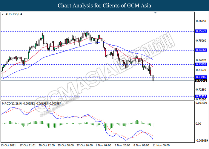 Dolar Australia telah didagangkan lebih rendah terhadap dolar dan pasangan mata wang lain dengan latar belakang data ekonomi yang lemah. Menurut kepada Biro Perangkaan Australia, data Employment Change Australia pada Oktober telah memberi bacaan sebanyak -46.3K, lebih rendah daripada jangkaan pasaran sebanyak 50.0K. Di samping itu, data Unemployment Rate Australia pada Oktober telah datang pada 5.2%, lebih teruk daripada jangkaan pasaran sebanyak 4.8%. Kedua-dua data pekerjaan tersebut menunjukkan pasaran buruh yang terjejas di Australia yang telah melembapkan perbelanjaan pengguna di rantau ini. Pada masa yang sama, data pekerjaan Australia yang lebih lembut telah mengurangkan kemungkinan untuk kenaikan kadar lebih awal daripada jangkaan daripada Reserve Bank of Australia (RBA). Selain itu, pasangan mata wang ini juga melanjutkan kerugiannya di tengah-tengah kebimbangan terhadap peningkatan inflasi. Data CPI AS yang lebih baik daripada jangkaan mencadangkan tekanan inflasi yang melonjak telah meningkatkan spekulasi pasaran bahawa Fed akan meningkatkan kadarnya lebih awal daripada jangkaan. Semasa penulisan, pasangan AUD/USD merosot sebanyak 0.27% kepada 0.7305.