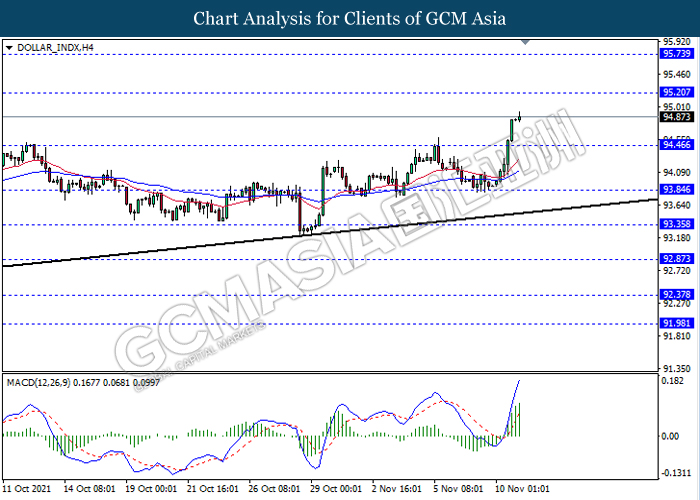 DOLLAR_INDX, H4: Indeks dolar telah didagang dengan lebih tinggi susulan dengan pemecahan pada tahap rintangan sebelumnya 95.20. MACD yang memaparkan isyarat momentum bullish mencadangkan dolar untuk melanjutkan keuntungannya ke arah tahap rintangan 95.20.
