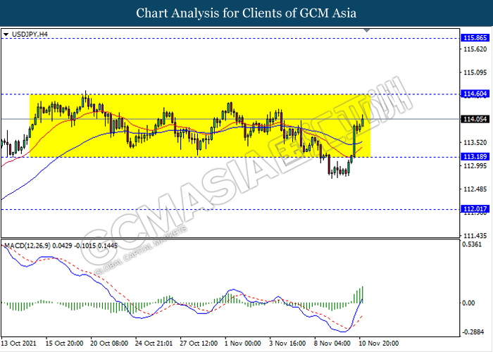 GOLD_, H4: Harga emas telah didagang dengan lebih tinggi sementara ia sedang menguji tahap rintangan 1857.75. MACD yang memaparkan isyarat momentum bullish mencadangkan komoditi ini untuk melanjutkan keuntungannya selepas ia memecah tahap rintangan tersebut.