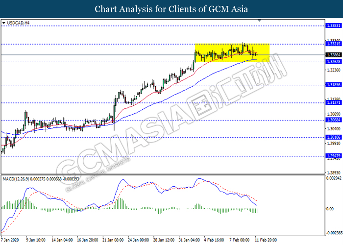 USDCAD, H4: USDCAD kekal didagang dalam saluran sisi susulan dengan pengunduran dari tahap rintangan 1.3320 baru-baru ini. Namun, MACD yang memaparkan isyarat bias bearish mencadangkan pasangan ini untuk didagang dengan lebih rendah selepas ia memecah tahap sokongan 1.3260.