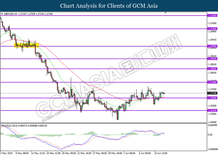 GBPUSD, H4: GBPUSD telah didagang dengan lebih tinggi berikutan dengan lantunan dari tahap sokongan 1.2690. MACD yang menunjukkan isyarat bias bullish mencadangkan pasangan ini untuk melanjutkan lantunannya ke arah tahap rintangan di 1.2785.