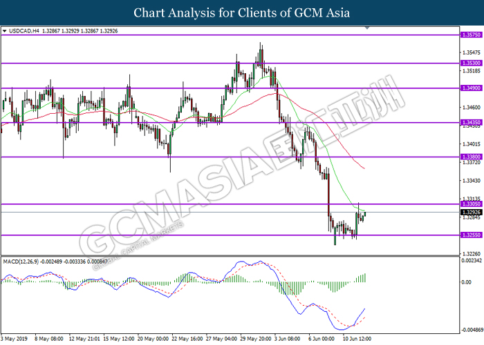 USDCAD, H4: USDCAD telah didagang dengan lebih tinggi sementara menguji berdekatan tahap rintangan di 1.3305. MACD yang memaparkan momentum bullish mencadangkan pasangan ini untuk melanjutkan kenaikannya selepas ia berjaya untuk memecahkan pada tahap rintangan tersebut.