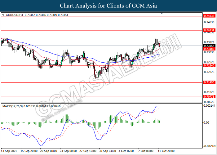 AUDUSD, H4: AUDUSD telah didagang dengan lebih rendah sementara ia sedang menguji berhampiran dengan tahap sokongan 0.7320. MACD yang memaparkan isyarat momentum bullish yang berkurangan mencadangkan pasangan ini untuk melanjutkan kerugiannya selepas ia memecah tahap sokongan tersebut.