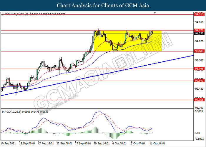 DOLLAR_INDX, H4: Indeks dolar telah didagang dalam saluran sisi sementara ia sedang menguji tahap rintangan 94.35. Namun, MACD yang memaparkan isyarat momentum bullish dengan formasi silang emas mencadangkan dolar untuk melanjutkan keuntungannya selepas ia memecah tahap rintangan 94.35.
