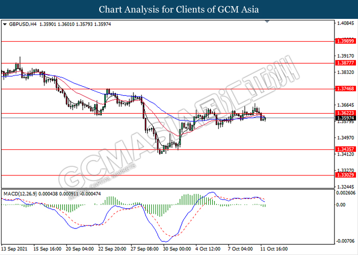 GBPUSD, H4: GBPUSD telah didagang dengan lebih rendah susulan dengan pengunduran dari tahap rintangan 1.3620. MACD yang memaparkan isyarat momentum bearish mencadangkan pasangan ini untuk melanjutkan pengundurannya ke arah tahap sokongan 1.3435.