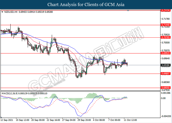 NZDUSD, H4: NZDUSD telah didagang dengan lebih rendah susulan dengan pengunduran dari paras tingginya. MACD yang memaparkan isyarat momentum bullish yang berkurangan mencadangkan pasangan ini untuk melanjutkan pengundurannya ke arah tahap sokongan 0.6880.