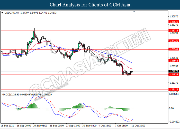 USDCAD, H4: USDCAD telah didagang dengan lebih tinggi susulan dengan lantunan dari tahap sokongan 1.2455. MACD yang memaparkan isyarat momentum bullish dengan formasi silang emas mencadangkan pasangan ini untuk melanjutkan lantunannya ke arah tahap rintangan 1.2585.
