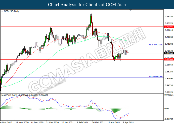 NZDUSD, Daily: NZDUSD telah didagang dengan lebih tinggi selepas ia melantun dari tahap sokongan 0.6960. Namun, MACD yang memaparkan momentum bullish yang berkurangan mencadangkan pasangan ini untuk mengalami pembetulan teknikal bagi jangka pendek.