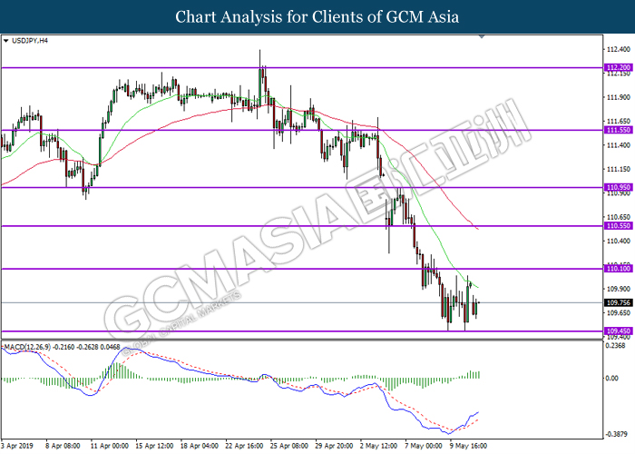 USDJPY, H4: USDJPY telah didagang dengan lebih tinggi selepas ia melantun dari tahap sokongan di 109.45. MACD yang menunjukkan isyarat bias bullish mencadangkan pasangan ini untuk melanjutkan lantunannya ke arah tahap rintangan di 110.10.