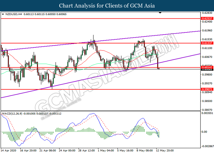 NZDUSD, H4: NZDUSD telah didagang dengan lebih rendah sementara kini menguji di tahap sokongan 0.6015. MACD yang memaparkan momentum bearish mencadangkan pasangan ini untuk melanjutkan kerugiannya selepas ia memecah tahap sokongan tersebut.