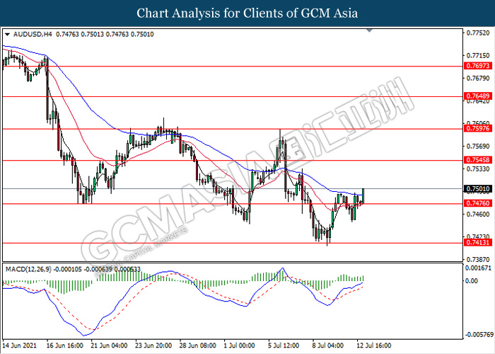 AUDUSD, H4: AUDUSD telah didagang dengan lebih tinggi susulan dengan lantunan dari tahap sokongan 0.7475. MACD yang memaparkan isyarat momentum bullish mencadangkan pasangan ini untuk melanjutkan keuntungannya ke arah tahap rintangan 0.7545.