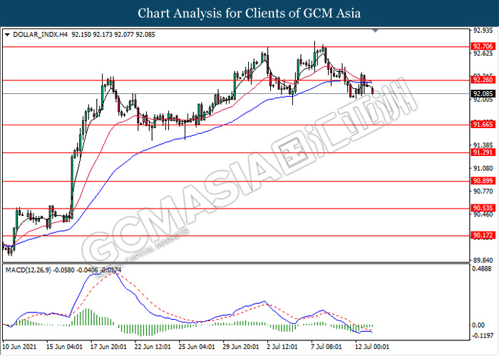 DOLLAR_INDX, H4: Indeks dolar telah didagang dengan lebih rendah susulan dengan pengunduran dari tahap rintangan 92.25. MACD yang memaparkan isyarat momentum bearish yang berterusan mencadangkan dolar untuk melanjutkan kerugiannya ke arah tahap sokongan 91.65.
