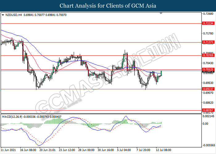 NZDUSD, H4: NZDUSD telah didagang dengan lebih tinggi sementara ia sedang menguji tahap rintangan 0.7010. MACD yang memaparkan isyarat bias bullish yang berterusan mencadangkan pasangan ini untuk melanjutkan keuntungannya selepas ia memecah tahap rintangan tersebut.