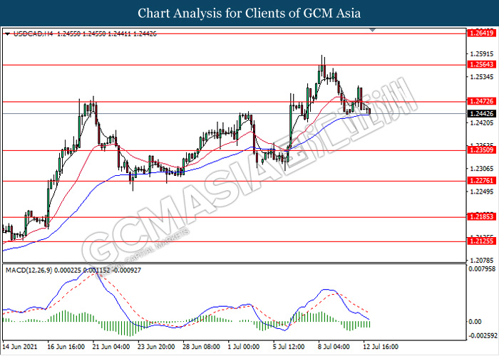 USDCAD, H4: USDCAD telah didagang dengan lebih rendah susulan dengan pengunduran dari tahap rintangan 1.2470. MACD yang memaparkan isyarat momentum bearish mencadangkan pasangan in untuk melanjutkan kerugiannya ke arah tahap sokongan 1.2350.