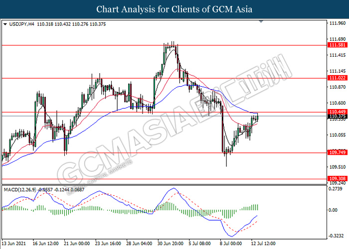 USDJPY, H4: USDJPY telah didagang dengan lebih tinggi sementara ia sedang menguji berhampiran dengan tahap rintangan 110.45. MACD yang memaparkan isyarat momentum bullish yang berterusan mencadangkan pasangan ini untuk melanjutkan keuntungannya selepas ia memecah tahap rintangan tersebut.