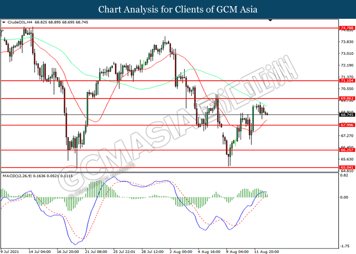 CrudeOIL, H4: Harga minyak mentah telah didagang dengan lebih tinggi selepas ia memecah tahap rintangan terdahulu 68.00. Namun, MACD yang memaparkan momentum bullish yang berkurangan mencadangkan komoditi ini untuk mengalami pembetulan teknikal bagi jangka pendek.