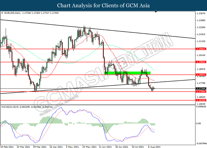 EURUSD, Daily: EURUSD telah didagang dengan lebih rendah sementara kini menguji di tahap sokongan 1.1705. MACD yang memaparkan momentum bearish mencadangkan pasangan ini untuk melanjutkan kerugiannya selepas ia memecah tahap sokongan tersebut.