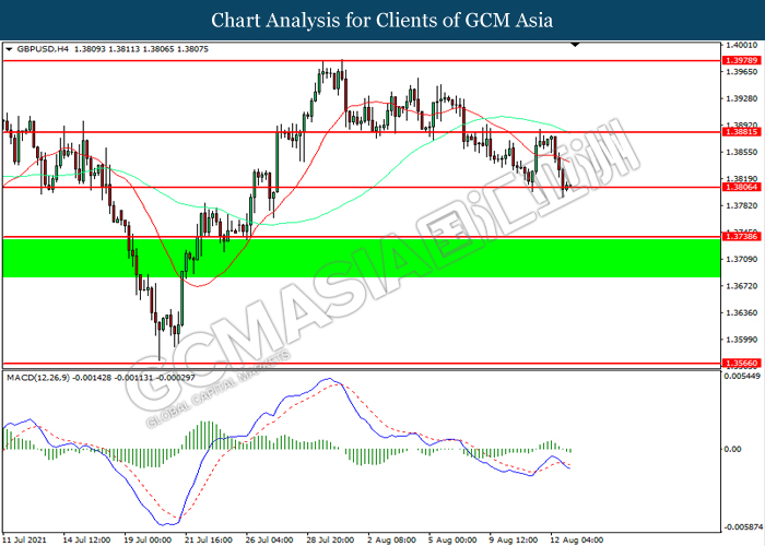 GBPUSD, H4: GBPUSD telah didagang dengan lebih rendah sementara kini menguji di tahap sokongan 1.3805. MACD yang memaparkan momentum bearish mencadangkan pasangan ini untuk melanjutkan kerugiannya selepas ia memecah tahap sokongan tersebut.