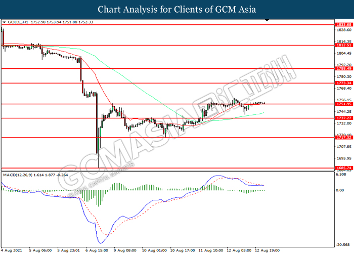 GOLD_, H1: Harga emas telah didagang dengan lebih tinggi sementara kini menguji di tahap rintangan 1751.95. MACD yang memaparkan momentum bearish yang berkurangan mencadangkan komoditi ini untuk melanjutkan keuntungannya selepas ia memecah tahap rintangan tersebut.
