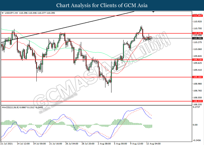 USDJPY, H4: USDJPY telah didagang dengan lebih tinggi sementara kini menguji di tahap rintangan 110.70. Namun, MACD yang memaparkan momentum bearish mencadangkan pasangan ini untuk mengalami pembetulan teknikal bagi jangka pendek.