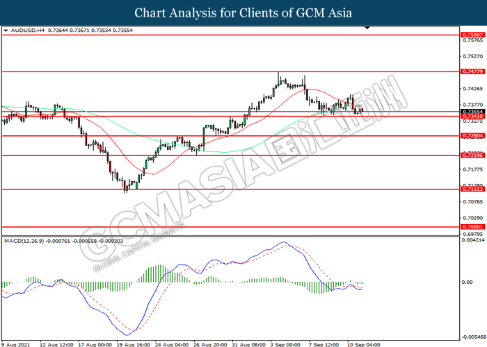 AUDUSD, H4: AUDUSD telah didagang dengan lebih rendah sementara kini menguji di tahap sokongan 0.7340. MACD yang memaparkan momentum bearish mecadangkan pasangan ini untuk melanjutkan kerugiannya selepas ia memecah tahap sokongan tersebut.