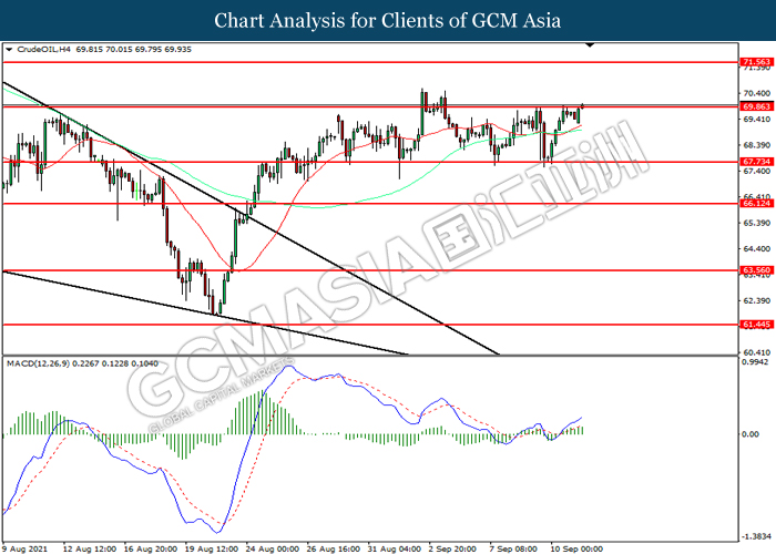 CrudeOIL, H4: Harga minyak mentah telah didagang dengan lebih tinggi sementara kini menguji di tahap rintangan 69.85. MACD yang memaparkan momentum bullish mencadangkan komoditi tersebut untuk melanjutkan keuntungannya selepas ia memecah tahap rintangan tersebut.