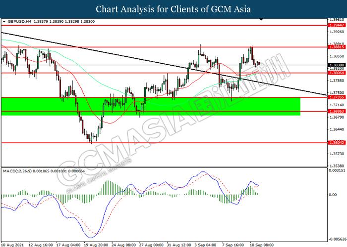 GBPUSD, H4: GBPUSD telah didagang dengan lebih rendah sementara kini menguji di tahap sokongan 1.3805. MACD yang memaparkan momentum bullish yang berkurangan mecadangkan pasangan ini untuk melanjutkan kerugiannya selepas ia memecah tahap sokongan tersebut.