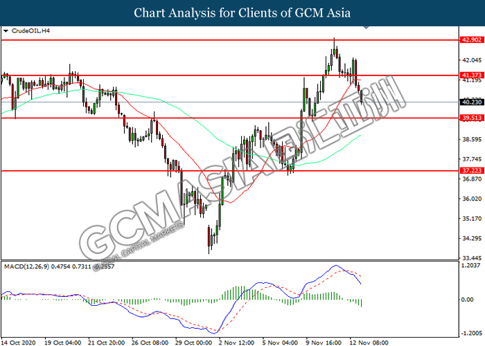 Di pasaran komoditi, harga minyak mentah menjunam sebanyak 1.48% kepada $ 40,24 setong semasa penulisan di tengah-tengah ketakutan COVID-19 dan peningkatan dalam inventori terus menguasai pasaran. Kes koronavirus A.S. mencapai tahap tertinggi harian baru pada hari Rabu, dengan 140,543 kes baru telah dilaporkan dan menandakan hari kesembilan berturut-turut di mana kes berada di atas 100,000. Koronavirus yang semakin teruk akan menjejaskan pemulihan ekonomi dan mempengaruhi prospek penggunaan komoditi di masa depan. Selain itu, sentimen juga terus ditekan oleh peningkatan dalam inventori yang dilaporkan oleh EIA baru-baru ini. Sebaliknya, harga emas jatuh sebanyak 0.03% kepada $ 1877.68 se troy auns pada masa penulisan berikutan dengan kekuatan dolar.