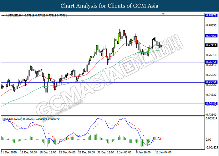 AUDUSD, H4: AUDUSD telah didagang dengan lebih rendah susulan dengan pengunduran dari tahap rintangan 0.7785. MACD yang memaparkan isyarat momentum bullish yang berkurangan mencadangkan pasangan ini untuk melanjutkan pengundurannya ke arah tahap sokongan 0.7655.