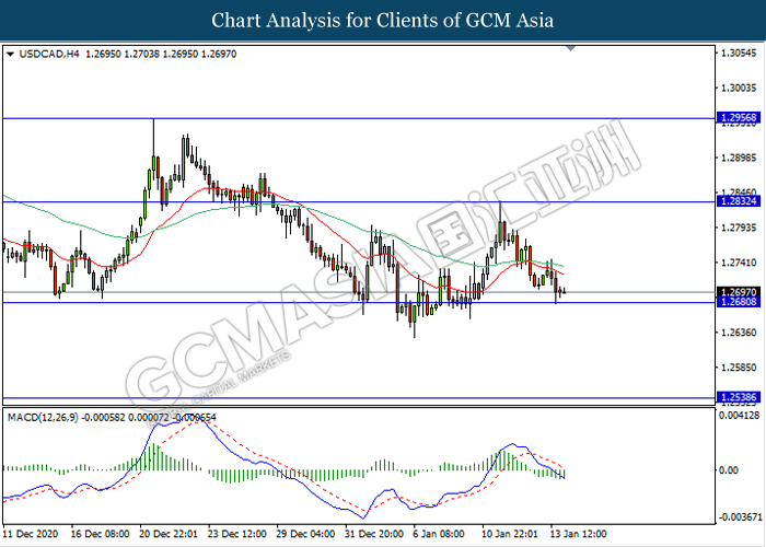 USDCAD, H4: USDCAD telah didagang dengan lebih rendah sementara ia sedang menguji tahap sokongan 1.2680. MACD yang memaparkan isyarat momentum bearish yang berterusan mencadangkan pasangan ini untuk melanjutkan kerugiannya selepas ia memecah tahap sokongan tersebut.