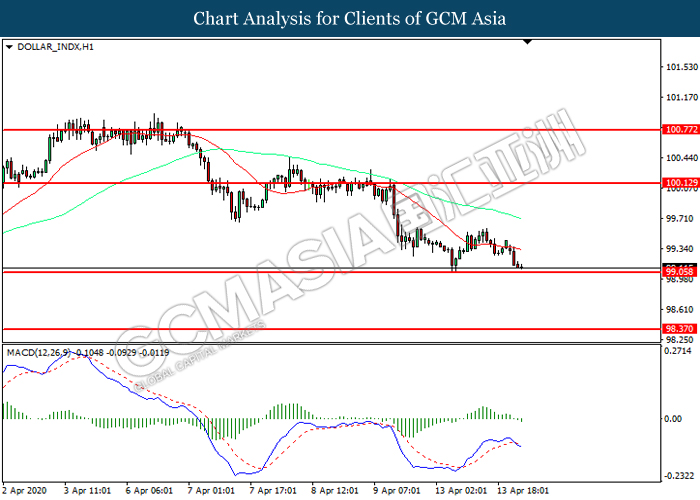 Indeks dolar yang didagang terhadap sebakul enam mata wang utama telah meneruskan semula penurunannya semasa lewat sesi Asia susulan dengan pasaran bersedia untuk menghadapi musim pendapatan AS yang kecewa. Jangkaan tersebut datang selepas AS mengumumkan pada Khamis bahawa lebih daripada 16 juta orang memohon tuntutan pengangguran sejak 21 Mac. Oleh kerana musim pendapatan AS akan bermula pada hari Selasa, para pelabur bersedia untuk laporan ekonomi yang buruk semasa dalam krisis yang paling gelap bulan ini. Selain itu, peningkatan dalam hutang dan defisit belanjawan AS juga memberi tekanan tambahan kepada dolar AS. Menurut kepada laporan, defisit belanjawan persekutuan Amerika Syarikat berada pada landasan untuk menuju kepada tahap melebihi $ 3.8 trilion tahun ini walaupun dengan Kongres tidak merancang untuk perbelanjaan rangsangan lebih banyak. Hutang negara juga boleh naik ke tahap yang tidak dilihat sejak negara muncul dari Perang Dunia Kedua. Sementara itu, paun sterling terus meningkat walaupun dengan lanjutan dalam sekatan di UK. Jumlah kematian daripada koronavirus di UK telah melonjak melebihi 11,000, tatapi, pasaran secara keseluruhan tidak dijejaskan oleh nombor tersebut susulan dengan para pelabur lebih menumpukan perhatian kepada angka 20,000 dari AS yang merupakan pusat global. Di samping itu, keluaran Perdana Menteri U.K Boris Johnson dari ICU baru-baru ini kekal menyokong permintaan untuk mata wang paun sterling. Menurut kepada Guardian, jurucakap Boris Johnson menyatakan bahawa beliau sedang memberi tumpuan kepada pemulihan. Pada masa penulisan, indeks dolar telah jatuh sebanyak 0.18% kepada 99.17 manakala GBP / USD telah meningkat sebanyak 0.48% kepada 1.2564.