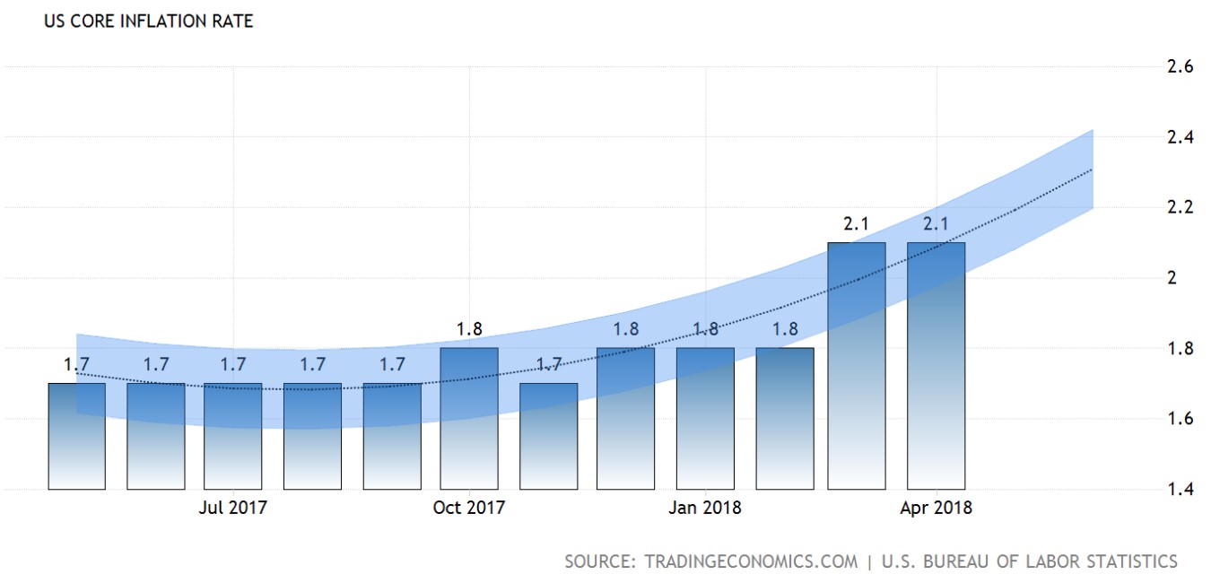 Kadar inflasi teras AS telah tersasar daripada jangkaan bulan April dengan bacaan sebenar sebanyak 2.1% berbanding ramalan iaitu 2.2%.
