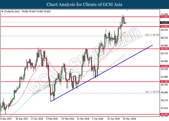 CrudeOIL, Daily: Harga minyak mentah telah didagang dengan lebih tinggi selepas ia melantun sebelum tahap sokongan di 70.00. Kedua-dua garisan MA yang masih melebarkan jarak ke atas mencadangkan bias bullish. Oleh itu, aliran utama bullish masih mencadangkan harga komoditi ini untuk meningkat selanjutnya dan menuju ke arah tahap rintangan di 71.55.