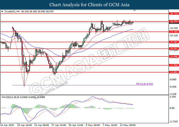 CrudeOIL, H4: Harga minyak mentah telah didagang dengan lebih tinggi sementara ia sedang menguji tahap rintangan di 26.40. MACD yang menunjukkan isyarat momentum bearish yang berkurangan mencadangkan komoditi ini untuk melanjutkan keuntungannya selepas ia berjaya memecah tahap rintangan di 26.40.