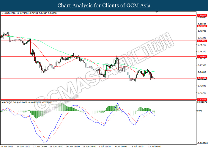 AUDUSD, H4: AUDUSD telah didagang dengan lebih rendah sementara kini menguji di tahap sokongan 0.7440. MACD yang memaparkan mometnum bearish mencadangkan pasangan ini untuk melanjutkan kerugiannya selepas ia memecah tahap sokongan tersebut.