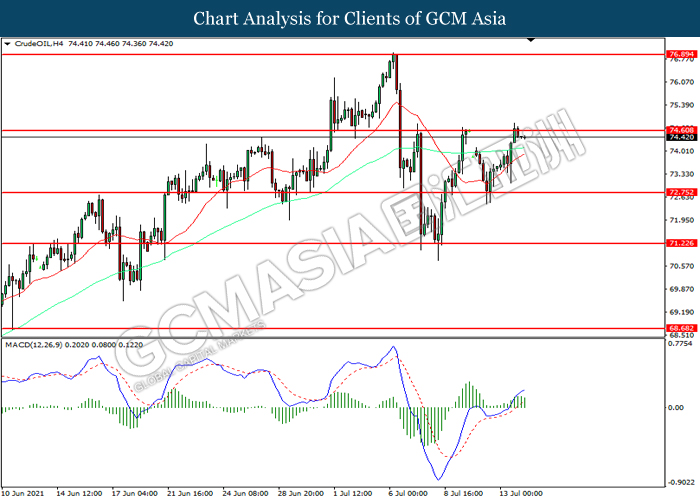 CrudeOIL, H4: Harga minyak mentah telah didagang dengan lebih tinggi sementara kini menguji di tahap rintangan 74.60. Namun, MACD yang memaparkan momentum bullish yang berkurangan mencadangkan komoditi ini untuk mengalami pembetulan teknikal bagi jangka pendek.