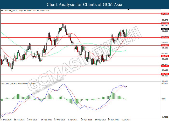 Indeks Dolar yang didagang terhadap sebakul enam pasangan mata wang utama telah melonjak dengan ketara dengan latar belakang peningkatan kadar inflasi yang ketara dari Unites States semalam, yang mencetuskan harapan bahawa Federal Reserve akan bermula mengetatkan program pembelian bonnya sambil mengurangkan pembelian asetnya yang besar untuk memerangi risiko inflasi yang tinggi pada masa depan. Pengetatkan dalam proses pembelian bon akan menyebabkan panik ke pasaran bon global, sementara mengurangkan peredaran wang dalam Dolar AS dan memberikan momentum bullish ke atas Dolar AS. Menurut kepada Bureau of Labor Statistiks AS, U.S. Core Consumer Price Indeks (CPI) MoM telah meningkat dengan ketara dari bacaan terdahulu sebanyak 0.7% ke bacaan esbanyak 0.9%, lebih baik daripada jangkaan pasaran sebanyak 0.4%. Sementara itu, para pelabur akan dicadangkan untuk memberi fokus pada pernyataan dari Federal Reserve untuk menerima isyarat dagangan yang lanjutnya. Semasa penulisan, Indeks Dolar telah meningkat sebanyak 0.06% ke 92.81.
