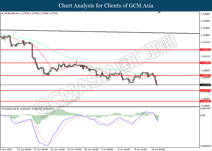 EURUSD, H4: EURUSD telah didagang dengan lebih rendah selepas ia berundur dari tahap rintangan 1.1850. MACD yang memaparkan momentum bearish mencadangkan pasangan ini untuk melanjutkan kerugiannya ke arah tahap sokongan 1.1725.
