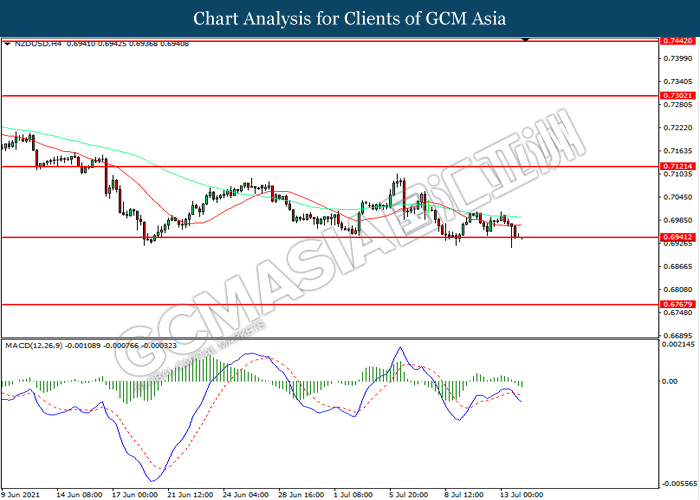NZDUSD, H4: NZDUSD telah didagang dengan lebih rendah sementara kini menguji di tahap sokongan 0.6940. MACD yang memaparkan momentum bearish mencadangkan pasangan ini untuk melanjutkan kerugiannya selepas ia memecah tahap sokongan tersebut.
