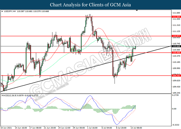 USDJPY, H4: USDJPY telah didagang dengan lebih tinggi selepas ia memecah tahap rintangan 110.45. MACD yang memaparkan momentum bullish mencadangkan pasangan ini untuk melanjutkan keuntungannya ke arah tahap rintangan 110.95.