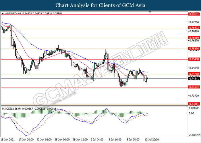 AUDUSD, H4: AUDUSD telah didagang dengan lebih rendah susulan dengan pemecahan pada tahap sokongan sebelumnya 0.7475. MACD yang memaparkan isyarat bias bearish mencadangkan pasangan ini untuk melanjutkan kerugiannya ke arah tahap sokongan 0.7415.