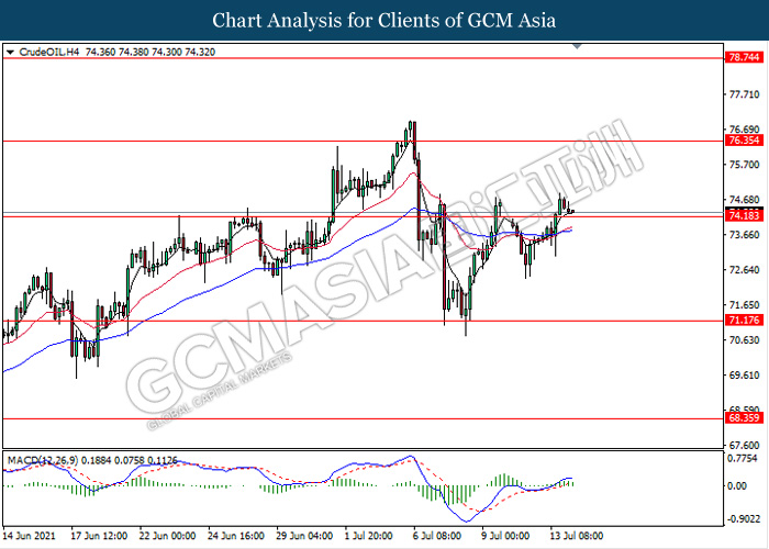 CrudeOIL, H4: Harga minyak mentah telah didagang dengan lebih tinggi susulan dengan pemecahan pada tahap rintangan sebelumnya 74.20. MACD yang memaparkan isyarat momentm bullish mencadangkan komoditi ini untuk melanjutkan keuntungannya ke arah tahap rintangan 76.35.