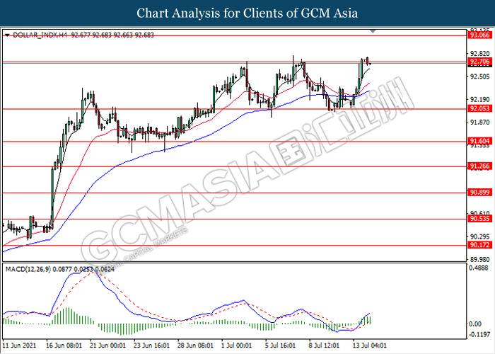 DOLLAR_INDX, H4: Indeks dolar telah didagang dengan lebih tinggi sementara ia sedang menguji tahap rintangan 92.70. MACD yang memaparkan isyarat momentum bullish mencadangkan dolar untuk melanjutkan keuntungannya selepas ia memecah tahap rintangan tersebut.