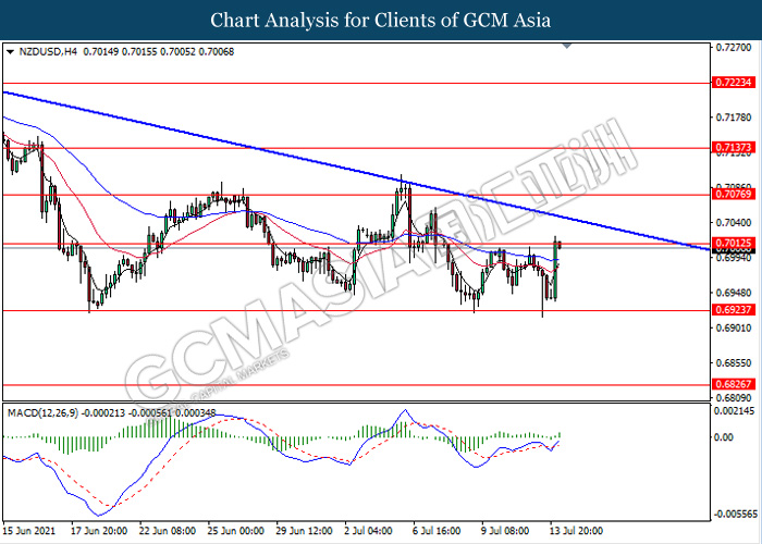 NZDUSD, H4: NZDUSD telah didagang dengan lebih tinggi sementara ia sedang menguji tahap rintangan 0.7010. MACD yang memaparkan isyarat momentum bullish dengan formasi silang emas mencadangkan pasangan ini untuk melanjutkan keuntungannya selepas ia memecah tahap rintangan tersebut.