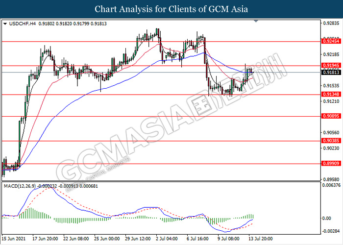 USDCHF, H4: USDCHF telah didagang dengan lebih tinggi sementara ia sedang menguji berhampiran dengan tahap rintangan 0.9195. Namun, MACD yang memaparkan isyarat momentum bullish mencadangkan pasangan ini untuk didagang dengan lebih rendah sebagai pembetulan teknikal ke arah tahap sokongan 0.9135.