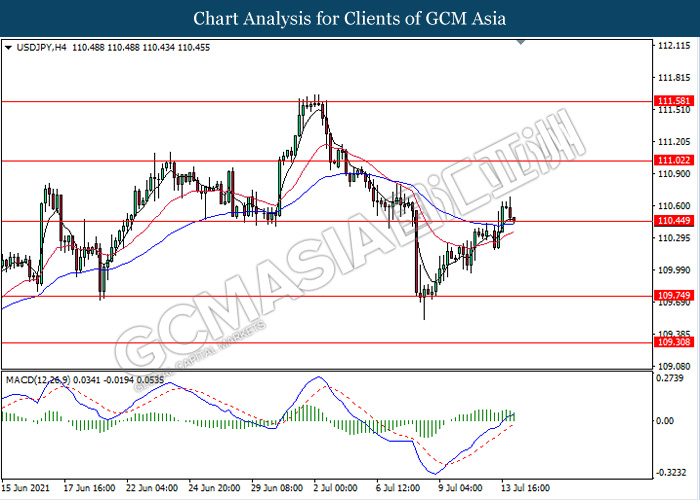 USDJPY, H4: USDJPY telah didagang dengan lebih rendah sementara ia sedang menguji tahap sokongan 110.45. MACD yang memaparkan isyarat momentum bullish yang berkurangan mencadangkan pasangan ini untuk didagang dengan lebih rendah selepas ia memecah tahap sokongan tersebut.