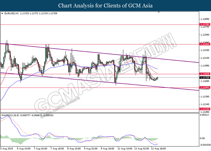 EURUSD, H1: EURUSD telah didagang dengan lebih tinggi berikutan dengan lantunan dari paras rendahnya. MACD yang menunjukkan penyusutan pada momentum bearish mencadangkan pasangan ini untuk melanjutkan keuntungannya ke arah tahap rintangan 1.1180.